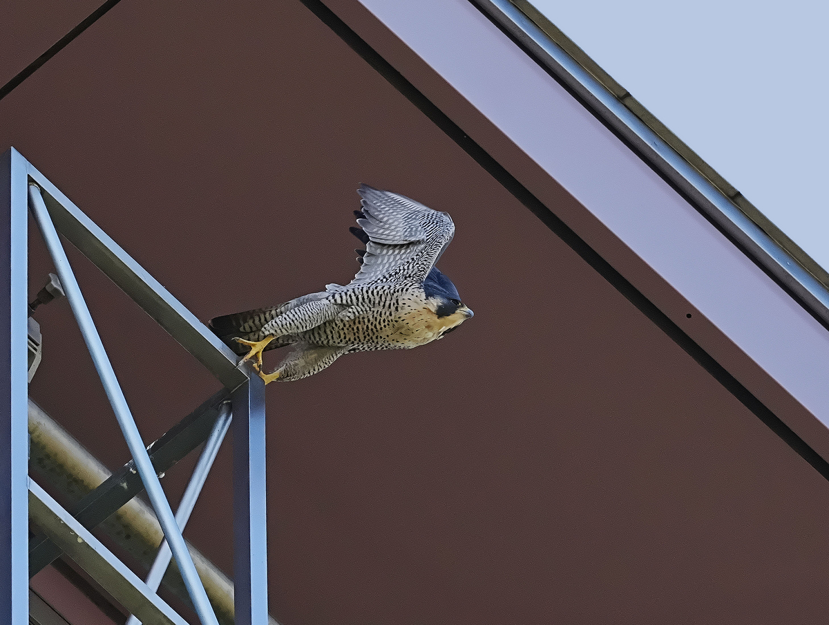 このハヤブサが最近やって来るハヤブサ・・・この日初めて同じ庇下に止まった。そして飛び出した・・・。