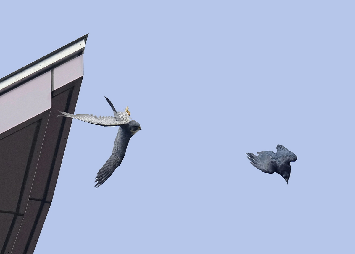 よそ者ハヤブサが飛び出した後に居着きのハヤブサが飛び出し、タワーを回り珍しく南側の屋根に舞い降りた・・・。