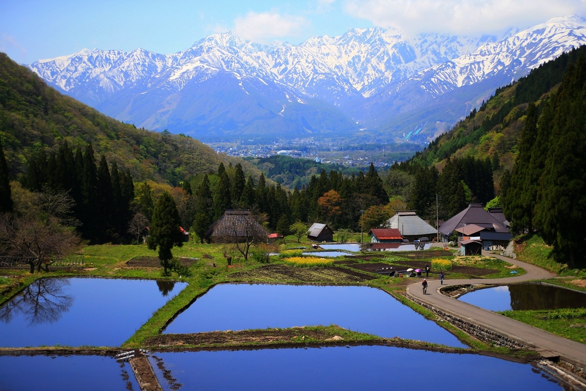 信州・・・青鬼集落の春から残雪の北アルプスを望む。