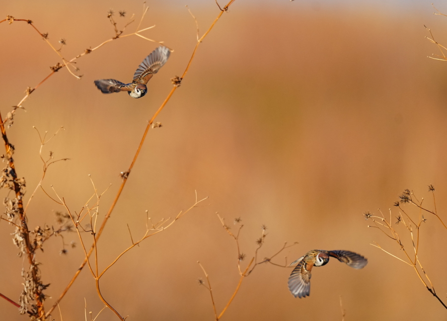 背景の枯野のボケが綺麗だったのでスズメで遊んだ・・・。